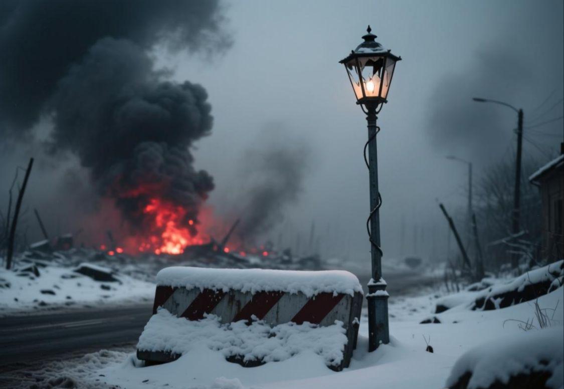 配图说明:一张灰暗色调的图片,画面背景是模糊的战火硝烟,前景是一个被大雪覆盖的路障,旁边是一个由于断电而熄灭的路灯,营造出一种寒冷且压抑的战场真实氛围。