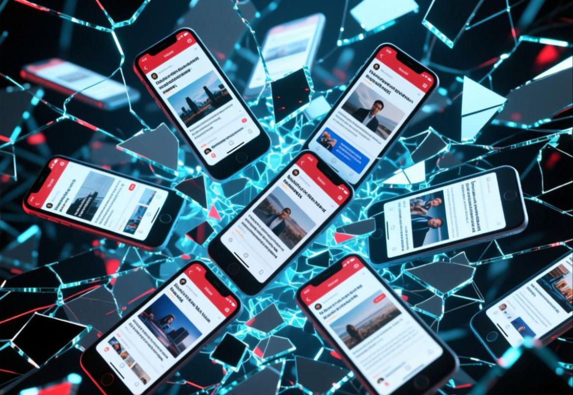 配图说明:一张具有现代感的图片,画面中无数个手机屏幕像碎片一样漂浮,每个屏幕里都显示着不同的新闻标题,背景是杂乱的线条,象征信息过载和真假难辨。