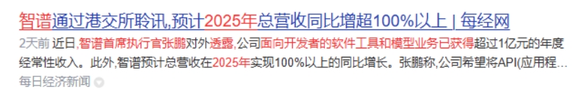 据媒体报道,智谱在2024年的总营收预计为4200万美元,其中来自AI开发工具的年度经常性收入已突破1400万美元。智谱CEO张鹏曾于2025年12月初透露,智谱面向开发者的软件工具和模型业务收入已经获得超过1亿元人民币(合1400万美元)的年度经常性收入,并预计在2025年总营收实现100%以上的增长。
