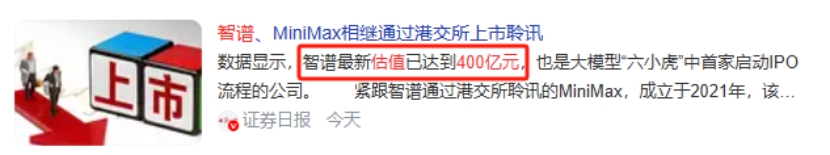 在估值方面,经过多轮融资后智谱最新估值已达到400亿元,是大模型“六小虎”中估值最高的。