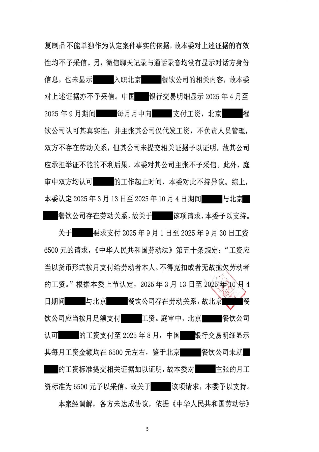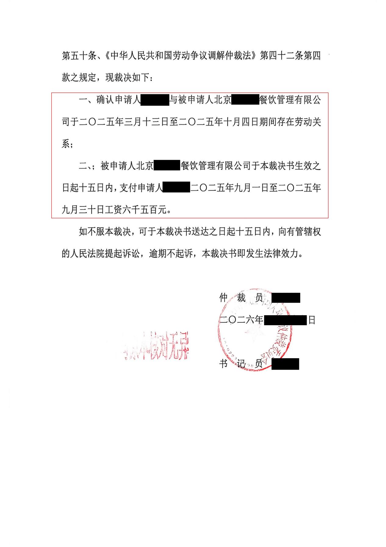 最终,仲裁委采纳了马丹阳律师团队的代理意见。裁决书明确指出,用人单位虽主张其仅代发工资、不负责人员管理,但未提交相关证据予以证明,应承担举证不能的不利后果。结合双方均认可的工作起止时间,仲裁委依法确认当事人与北京某餐饮管理有限公司于2025年3月13日至2025年10月4日期间存在劳动关系,并裁决用人单位支付拖欠的工资。