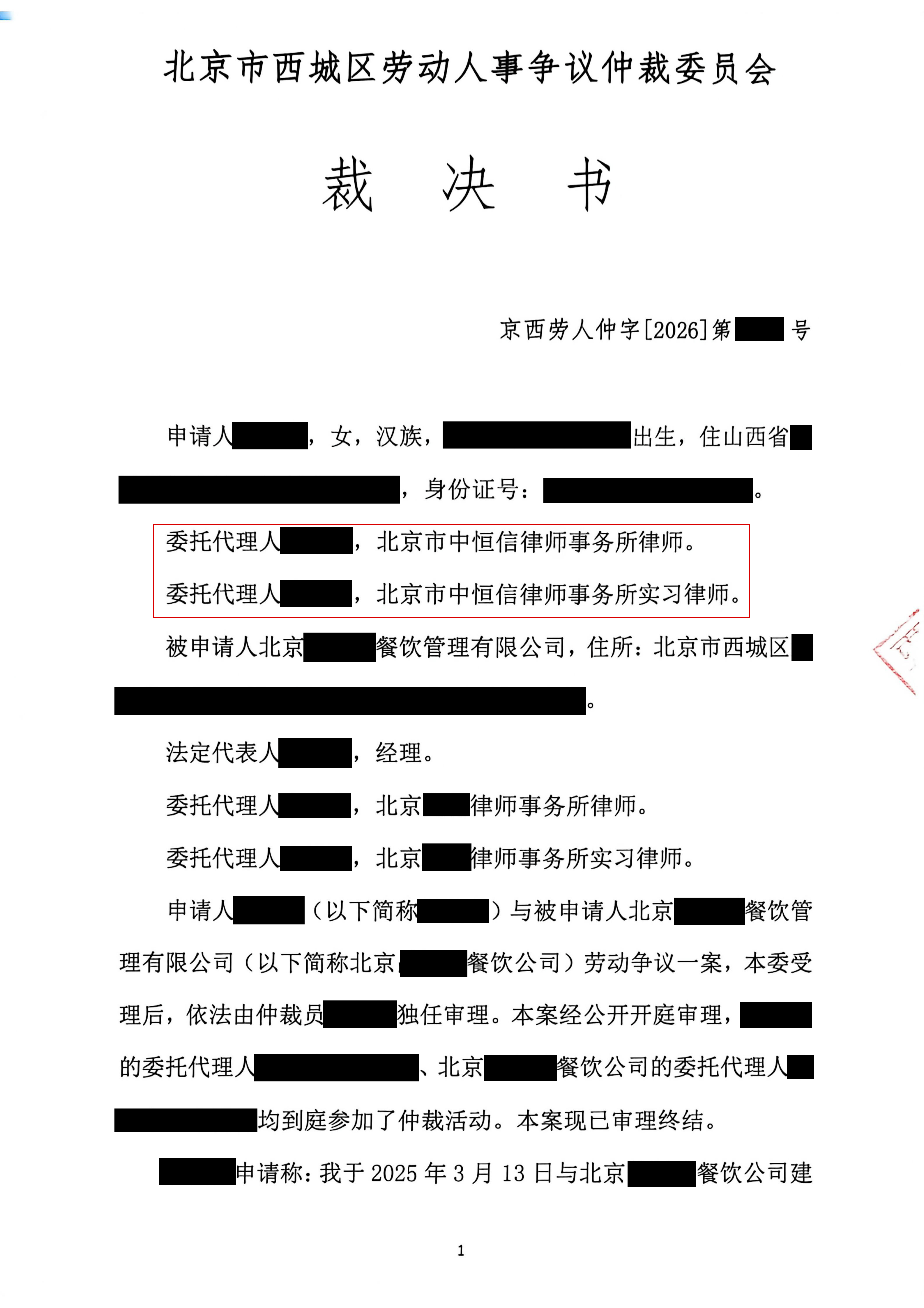 凭借对劳动争议案件的深刻理解与精准把握,中恒信律师事务所马丹阳律师团队在代理的一起确认劳动关系及工资支付案件中,面对复杂的加盟模式与证据缺失的困境,通过调整办案策略、重构证据链条,成功帮助当事人确认了与用人单位之间的劳动关系,最终获得仲裁委的全面支持。