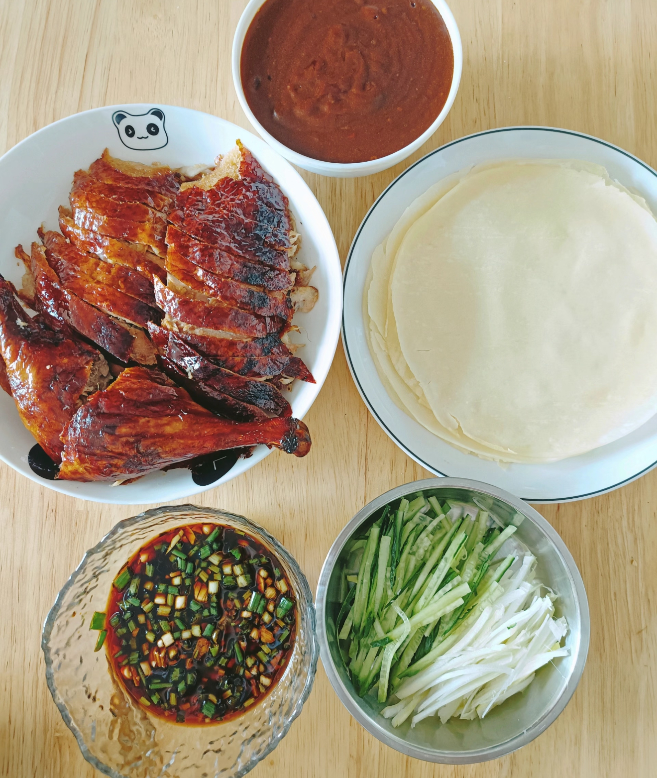 "叮——"烤箱计时器响起时,厨房里早已弥漫着焦糖色的香气。我戴着隔热手套端出烤盘,金黄酥脆的鸭皮在灯光下泛着油光,薄如蝉翼的饼皮在蒸笼里冒着热气,案板上整整齐齐码着翠绿的葱丝和琥珀色的甜面酱——这场景,活脱脱把老北京胡同里的烤鸭店搬进了自家厨房。