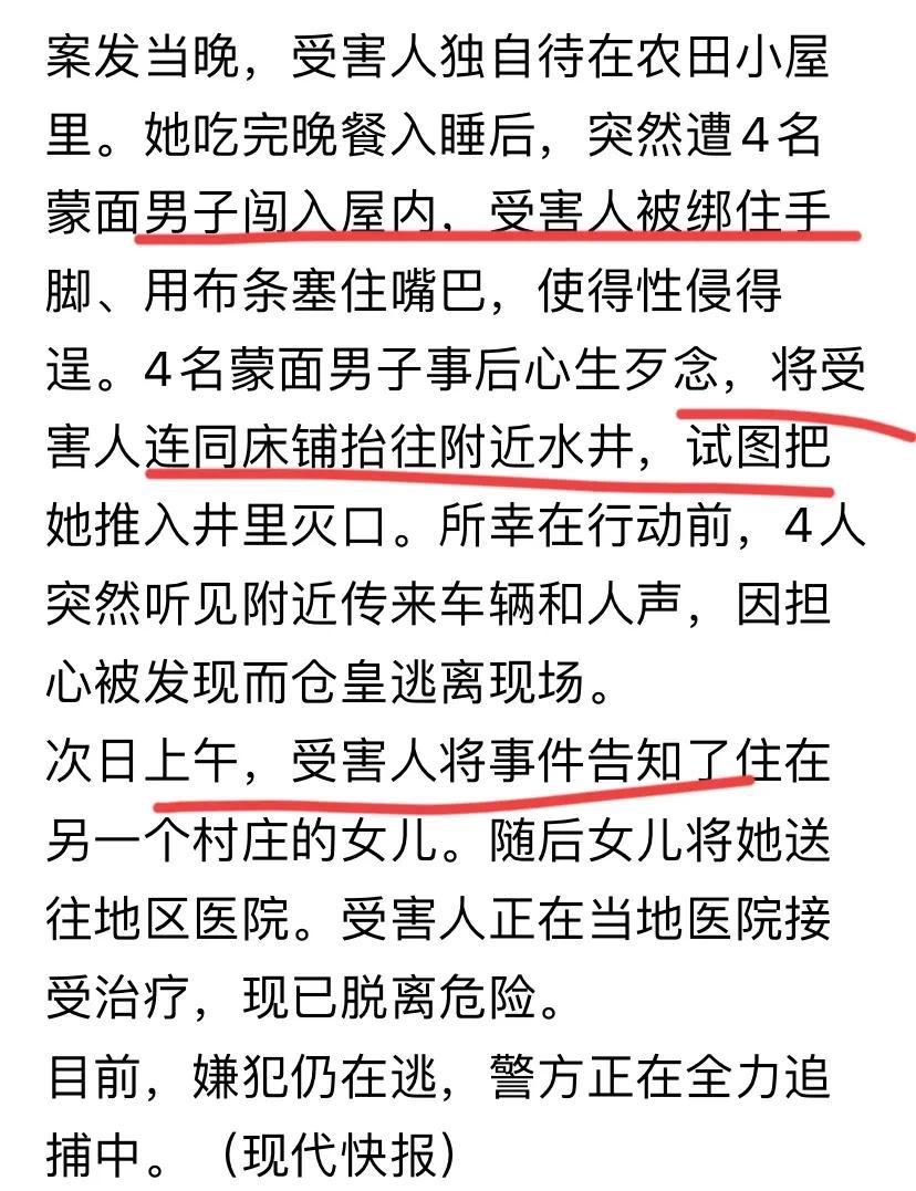 案发当晚,受害老人独自一人住在农田小屋,正当她入睡时,突然,4名蒙面男子闯入老妇家中,绑住她手脚、用布条堵住嘴巴,对老人实施了侵害。老妇已经是90的高龄了,根本禁不住被这么折腾。