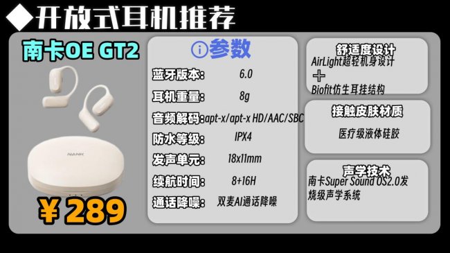 推荐四:南卡OE GT2(289元)推荐指数:⭐⭐⭐⭐⭐机型亮点:百元旗舰标杆产品,百元价格性能对标千元款