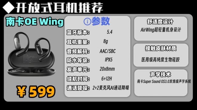 推荐一:南卡OE Wing开放式耳机 (599元)推荐指数:⭐⭐⭐⭐⭐机型亮点:百元满配旗舰之王,常年霸榜中高端口碑销量排行第一!