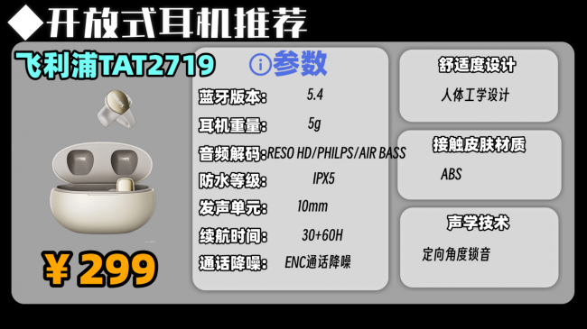 推荐五:飞利 浦TAT2719(299元)推荐指数:⭐⭐⭐机型亮点:贴合耳廓的设计不会带来不适