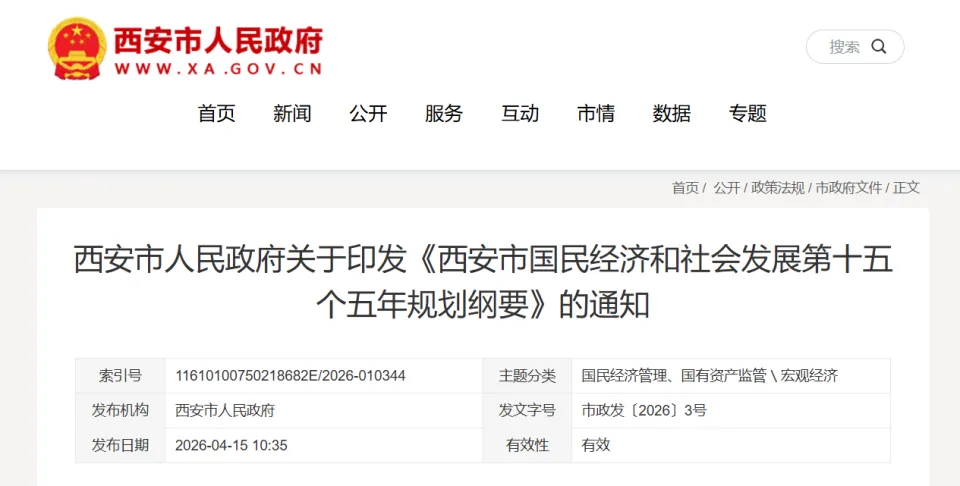 4月15日,西安市人民政府印发《西安市国民经济和社会发展第十五个五年规划纲要》。