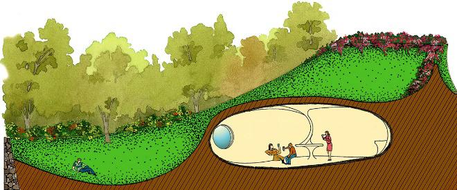 土壤和草地让保护膜免受太阳、风、冰雹和干湿循环等恶劣气候带来的伤害;同时也避免了膨胀和收缩产生的裂缝和带来的湿度影响。绿色的沙丘是几乎看不见的内部体量的包络线。从外面我们只能看到草、灌木、树和花。走在花园里并不会意识到其实就是走在屋顶上面。