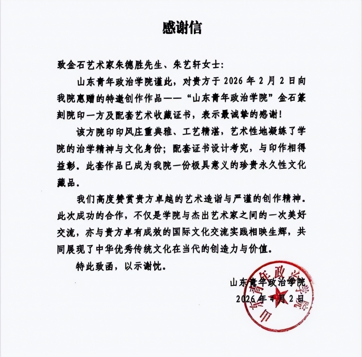 2026年4月2日,山东青年政治学院向朱德胜、朱艺轩发来感谢信。信中写道,该院印与收藏证书“共同展现了中华优秀传统文化在当代的创造力与价值”。据学院介绍,朱氏父女在创作过程中,反复研读学院治学精神与文化气质,力求将“庄重典雅”的印风与学院身份相融合;从版式设计、纸张选材到字体排布,每一处细节都精益求精,使印作与证书互为映衬。