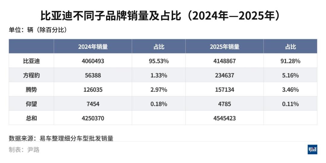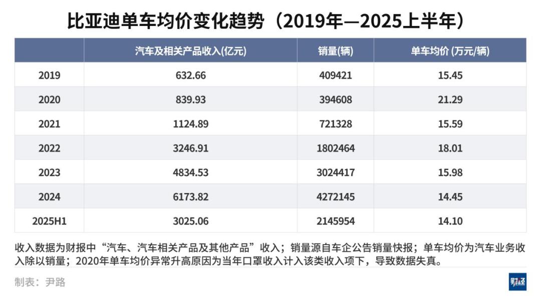 比亚迪总销量2023年突破300万辆,2024年突破400万辆,2025年突破450万辆。高端品牌(方程豹、腾势、仰望)的销量占比也在稳步上升,例如方程豹占比已从2024年的1.33%提升至2025年的5.16%。但与此同时,比亚迪单车均价却呈下滑趋势,2022年18.01万元,2023年15.98万元,2024年14.45万元,2025年上半年14.10万元。