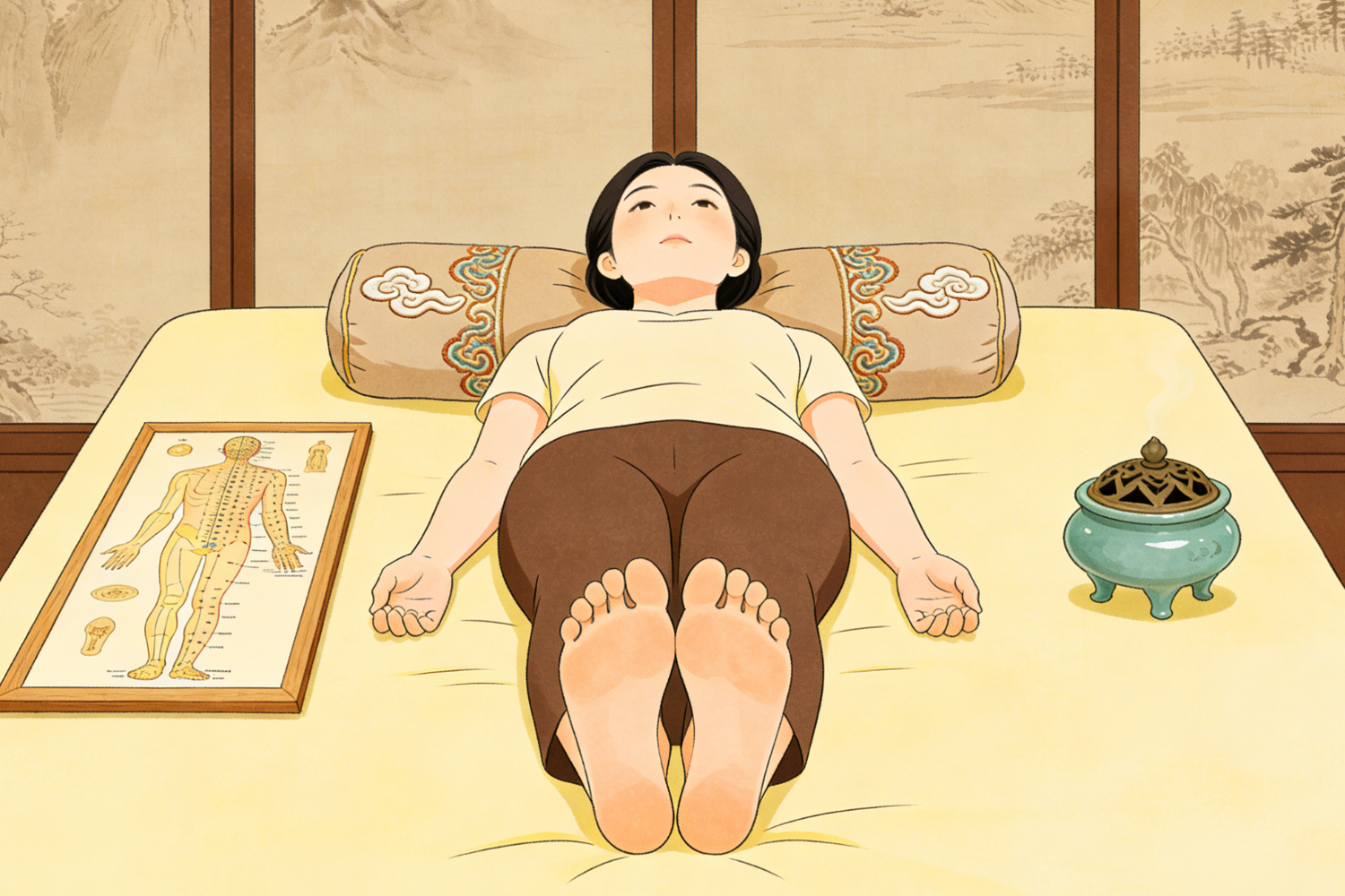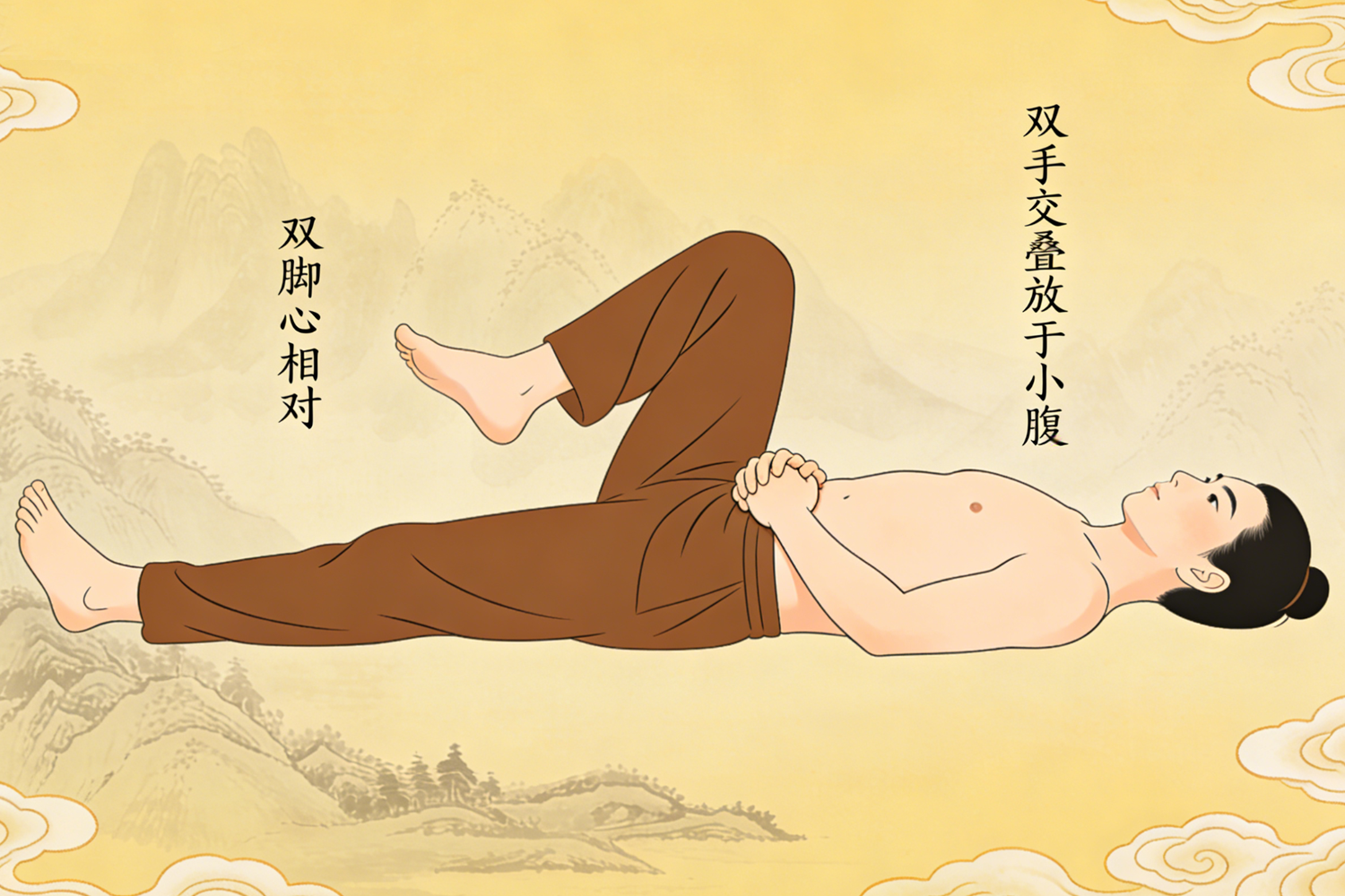 2、下肢姿势:双脚脚心(涌泉穴)相对贴合,双侧膝关节尽量放松、外展,使两腿呈菱形打开,形似环抱。可在膝下放置软枕或卷起的被褥支撑,以缓解腿部压力。