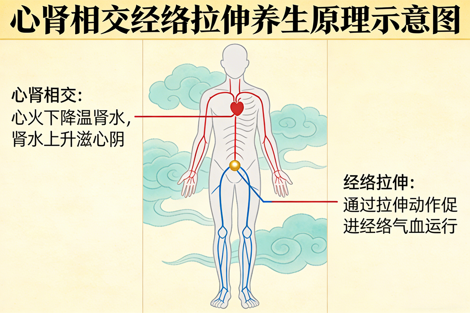 1、交通心肾:脚心涌泉是肾经的起始穴,手心劳宫是心包经的荥穴。脚心相对,有助激发肾水;手置头顶(近心脑),利于心火下潜。此姿势在静态中模拟了“心肾相交,水火既济”的能量循环。