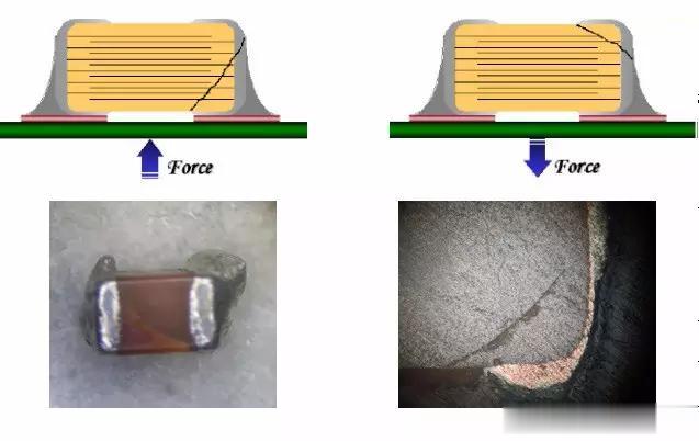 在机械力作用下板材弯曲变形时,陶瓷的活动范围受端位及焊点限制,破裂就会在陶瓷的端接界面处形成,这种破裂会从形成的位置开始,从45°角向端接蔓延开来。