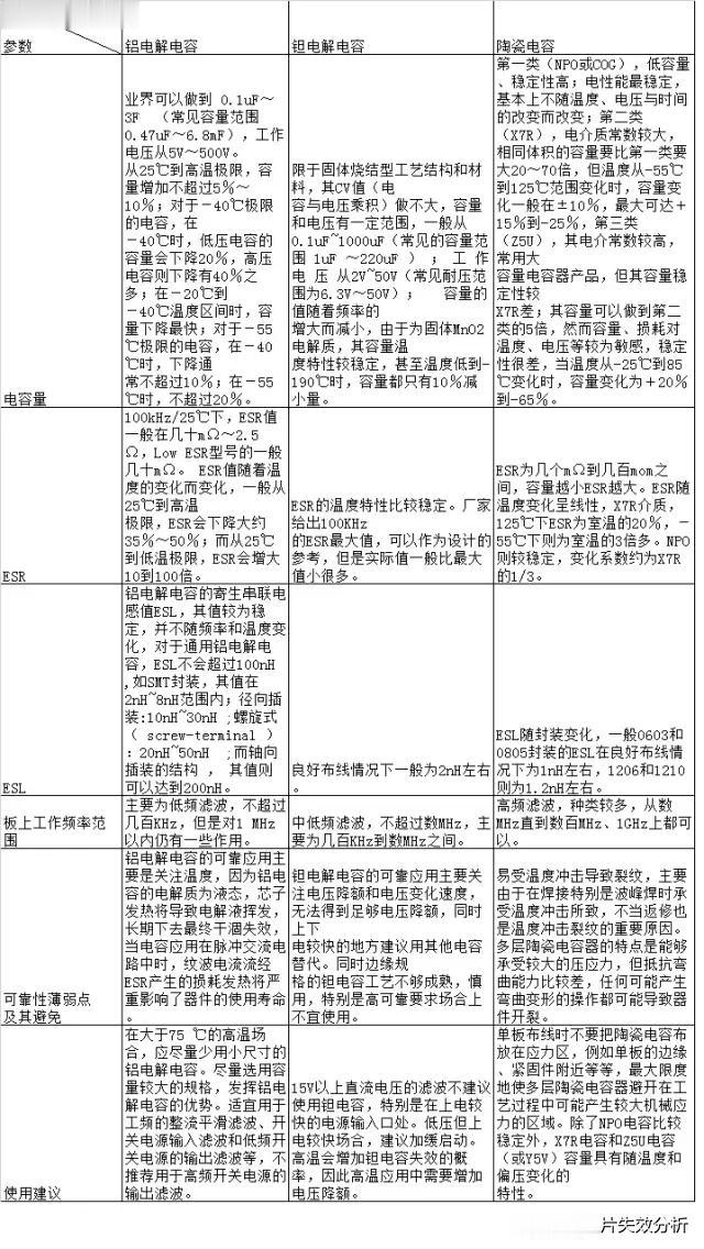 参数 钽电解电容 电容量限于固体烧结型工艺结构和材料,其CV值(电容与电压乘积)做不大,容量和电压有一定范围,一般从0.1uF~1000uF(常见的容量范围 1uF ~220uF ) ;工 作 电 压 从2V~50V(常见耐压范围为6.3V~50V); 容量的值随着频率的增大而减小,由于为固体MnO2电解质,其容量温度特性较稳定,甚至温度低到-190℃时,容量都只有10%减小量。 ESR ESR的温度特性比较稳定。厂家给出100KHz的ESR最大值,可以作为设计的参考,但是实际值一般比最大值小很多。 ESL 良好布线情况下一般为2nH左右。 板上工作频率范围 中低频滤波,不超过数MHz,主要为几百KHz到数MHz之间。 可靠性薄弱点 及其避免 钽电解电容的可靠应用主要关注电压降额和电压变化速度,无法得到足够电压降额,同时上下电较快的地方建议用其他电容替代。同时边缘规格的钽电容工艺不够成熟,慎用,特别是高可靠要求场合上不宜使用。 使用建议 15V以上直流电压的滤波不建议使用钽电容,特别是在上电较快的电源输入口处。低压但上电较快场合,建议加缓启动。高温会增加钽电容失效的概率,因此高温应用中需要增加电压降额。