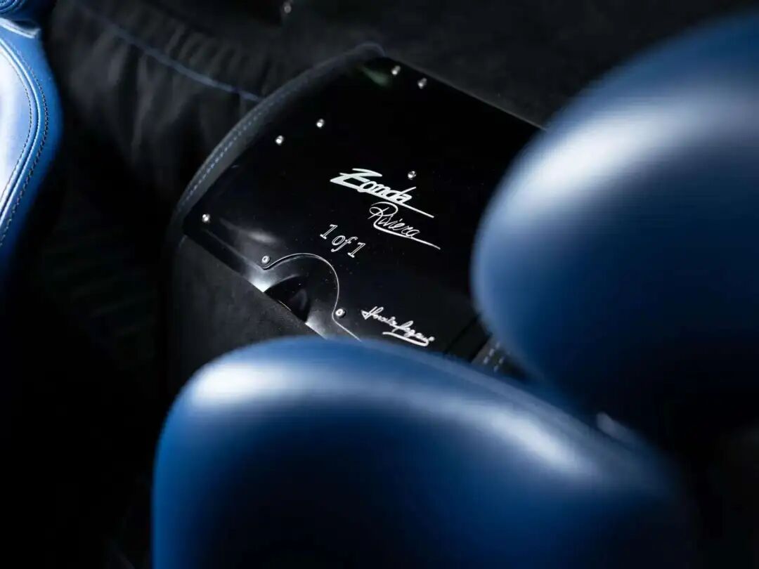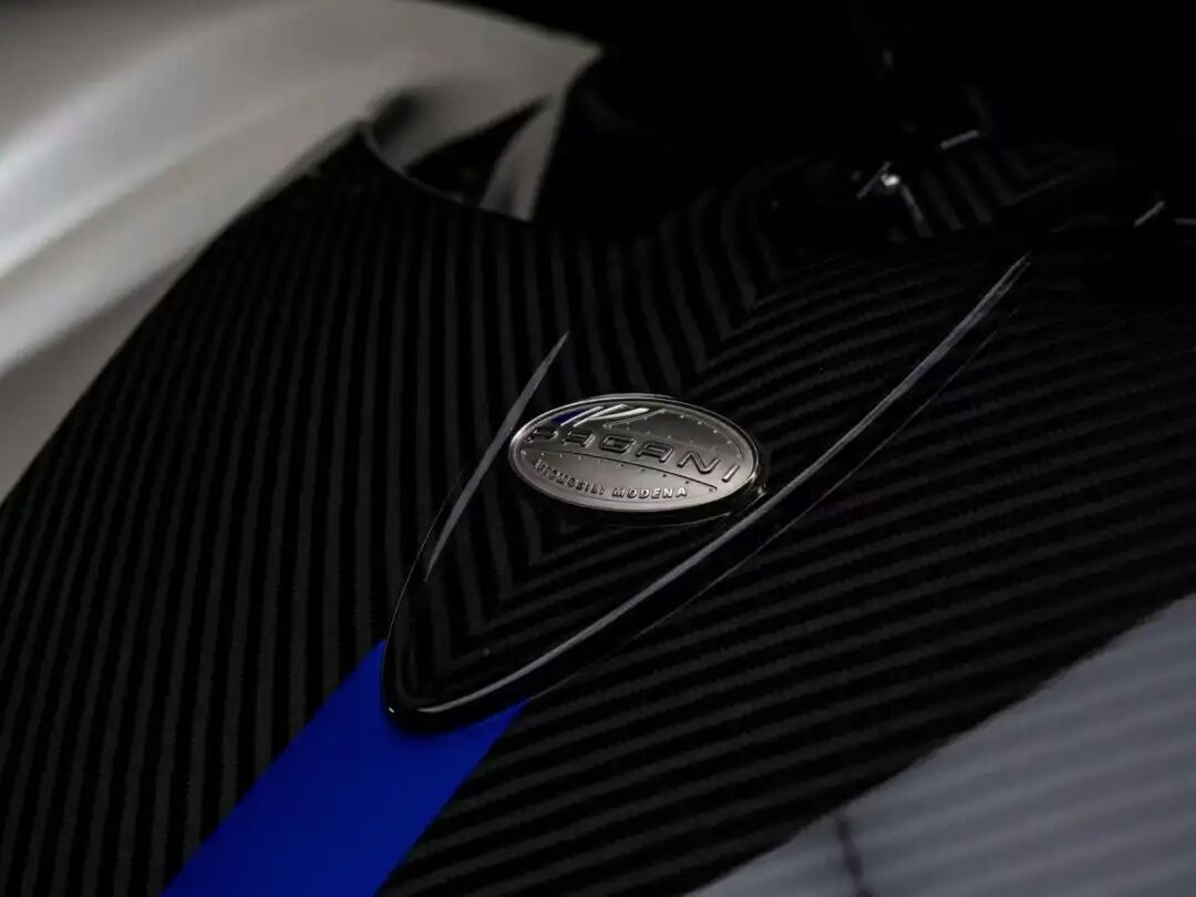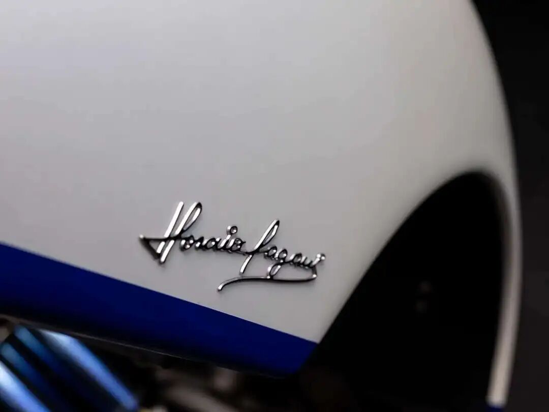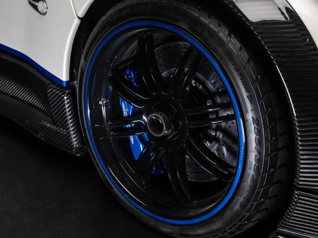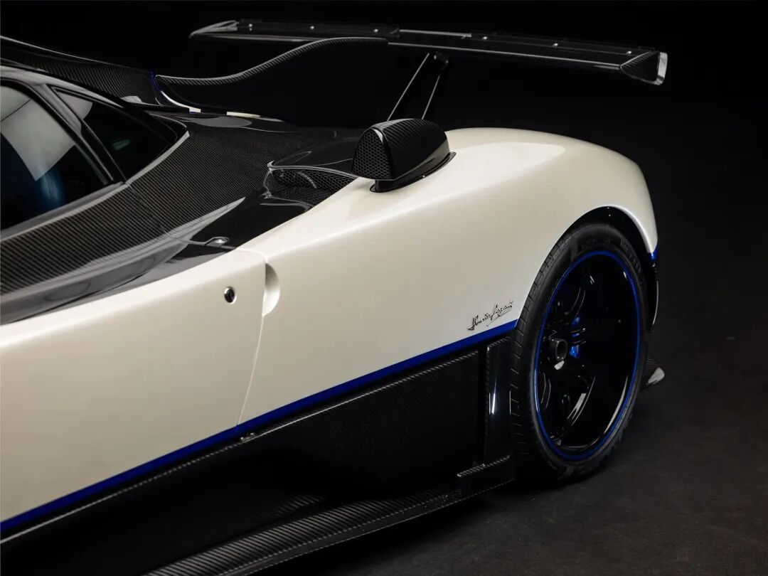 那么它特别在哪里?首先,外观与其他任何Zonda都不同。车身采用金属白涂装,引擎盖、车顶进气口、车门和后保险杠点缀着皇室蓝装饰。匹配的蓝色刹车卡钳与黑色轮毂上的蓝色饰条相得益彰。