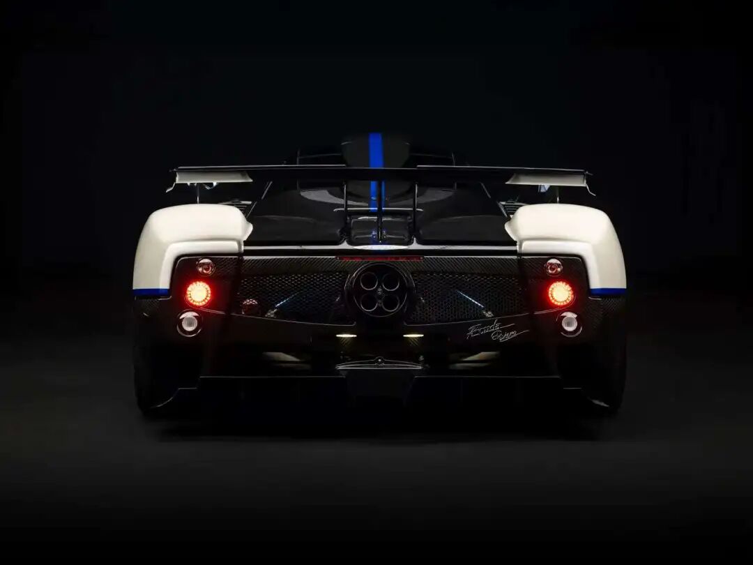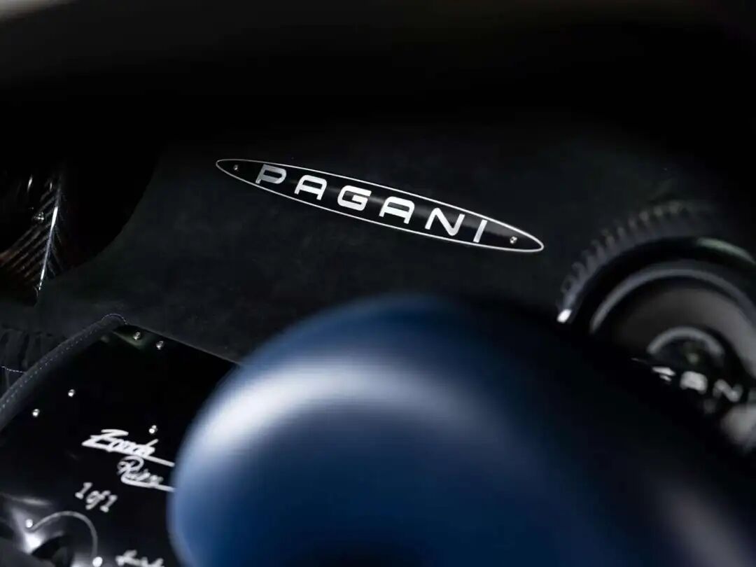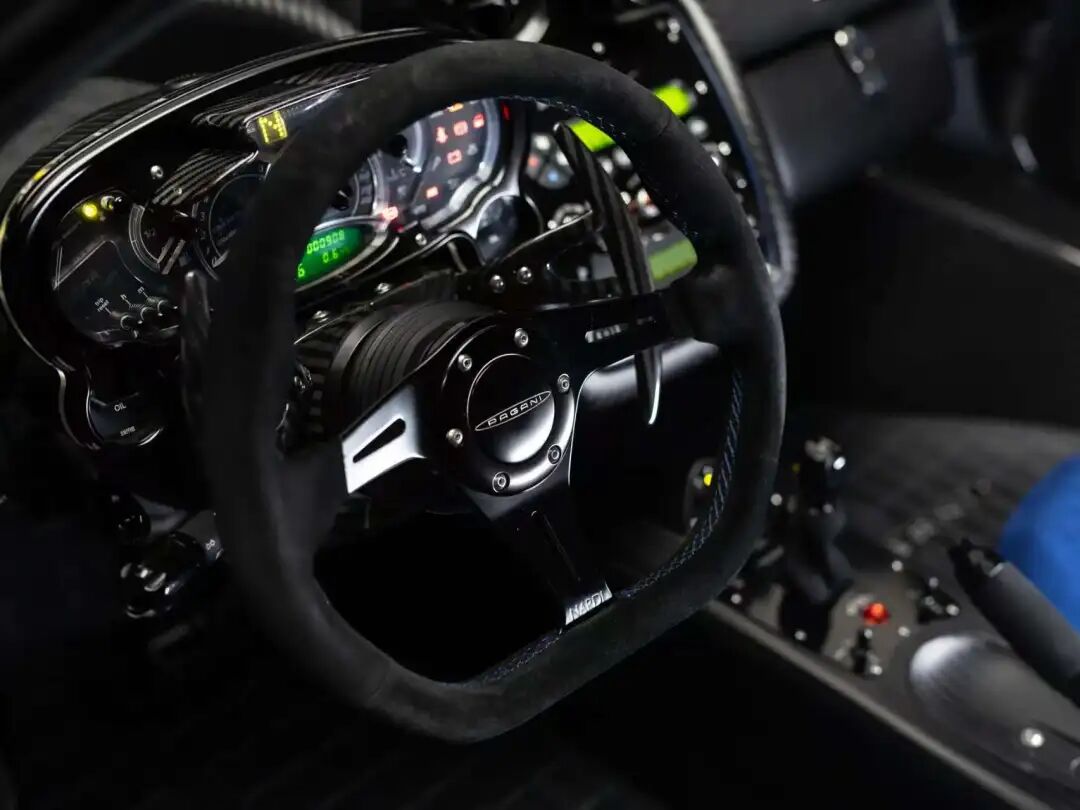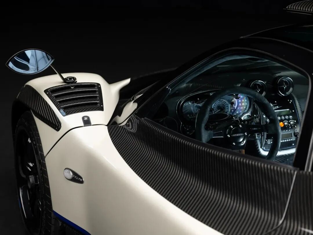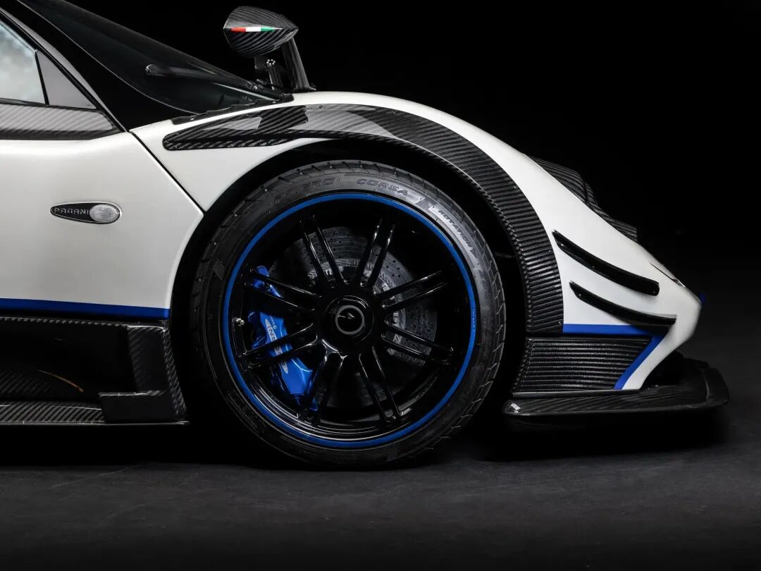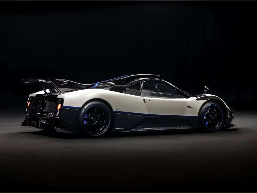 那么它特别在哪里?首先,外观与其他任何Zonda都不同。车身采用金属白涂装,引擎盖、车顶进气口、车门和后保险杠点缀着皇室蓝装饰。匹配的蓝色刹车卡钳与黑色轮毂上的蓝色饰条相得益彰。