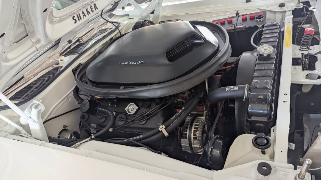 走近这台车,便能感受到Mopar经典的极致魅力:引擎盖上的Shaker进气套件高高隆起,露出那颗装着黑色褶皱气门室盖的426 Hemi,这是'Cuda的标志性设计,也是无数Mopar粉丝心中“最美的引擎模样”;车内保留了原厂所有配置,包括带麦克风和卡带录音机的R26 AM收音机,这份原汁原味的复古感,让它在众多修复车中脱颖而出。唯一的“非原厂改动”,是加装了71款'Cuda的标志性Billboard拉花,这份贴合车型的经典改装,既未破坏原厂质感,又让车身更具辨识度,成为修复中的点睛之笔。
