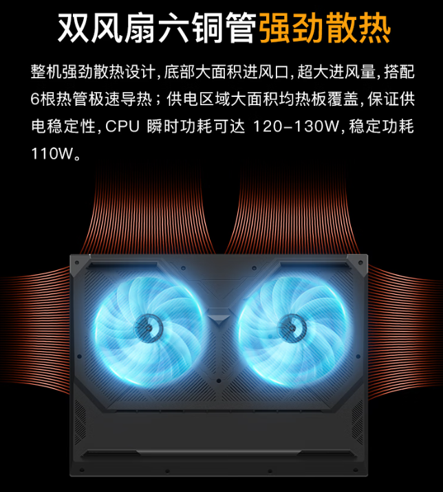 高性能的硬件,自然带来散热方面的压力,普通的双风扇四热管只能满足主流级别的游戏本,神舟(HASEE)战神T12 Pro采用更加强劲的双风扇六铜管散热设计。