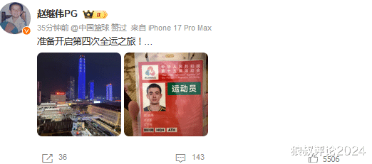 北京时间11月1日,辽宁男篮球员赵继伟更新社媒发文:“准备开启第四次全运之旅”。
