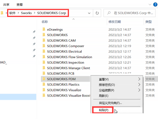 3、找到之前安装SW的时候设置的安装位置(例如我的位置是D:\Sworks\SOLIDWORKS Corp),在空白区域鼠标右键,选择【粘贴】。