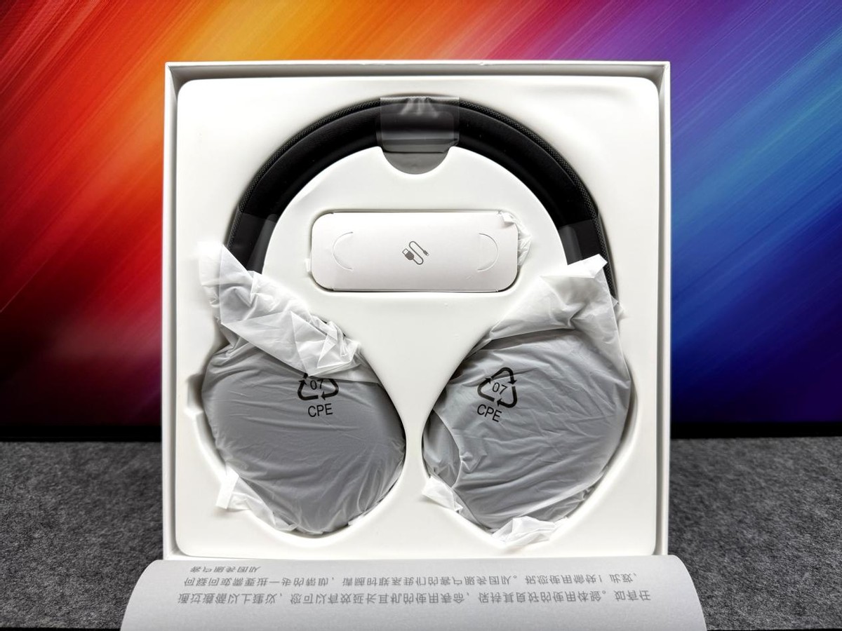 耳机用防水袋密封包装,头梁也用塑料妥善保护起来,细节到位。中间的纸盒是配件。