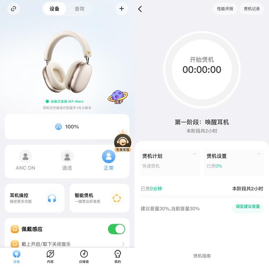 软件的界面非常简洁,可以看到耳机电量,功能从上到下一目了然。为了让耳机更快进入最佳状态,iKF还提供了煲机功能,耳机到手后可以按照提示操作,体验调校设备的乐趣。
