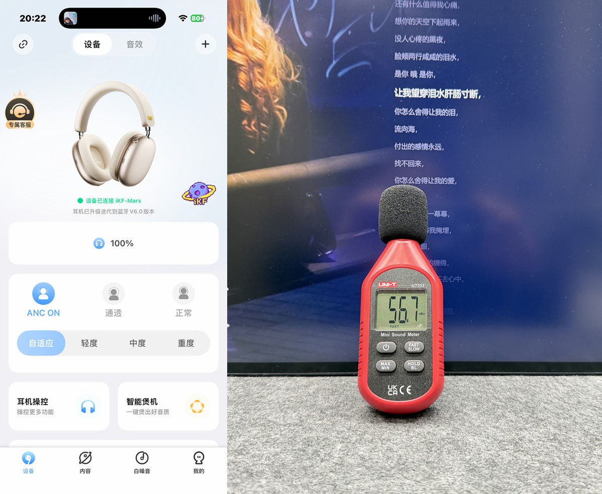 实测在打开重度降噪后播放音乐响度在56.7dB时声音被耳机完全抵消,相当给力。