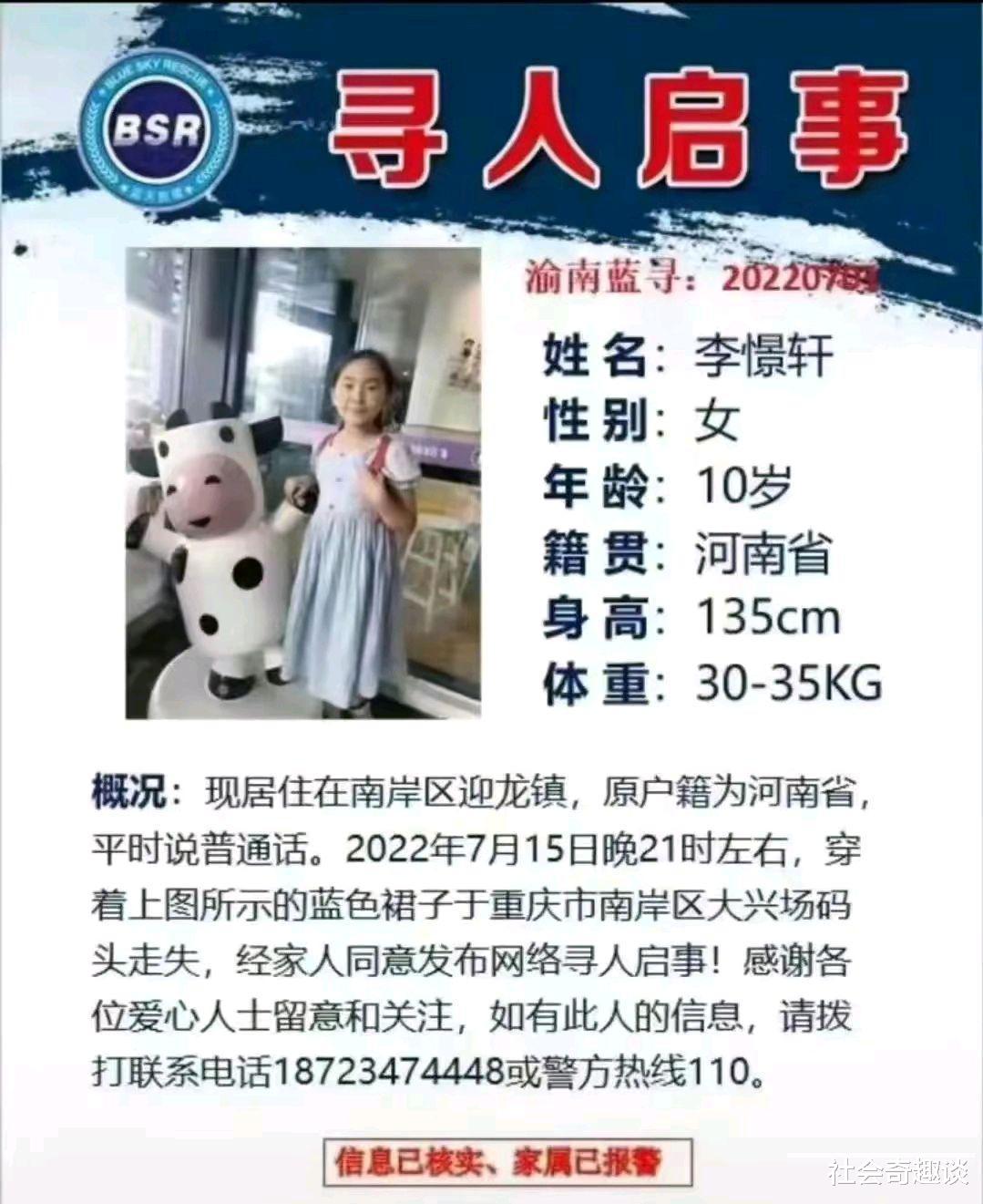 大家好!近几日,一个叫扬阳的母亲,为寻找10岁女儿李憬轩创建的短视频账号,登上了热榜。据杨阳称,女儿是2022年7月15日在重庆市南岸区大兴场码头失踪的,失踪时身穿蓝色连衣裙,扎马尾辫,脚穿红蜻蜓牌黑色凉鞋。女儿失踪这么久,她都已经快疯了。