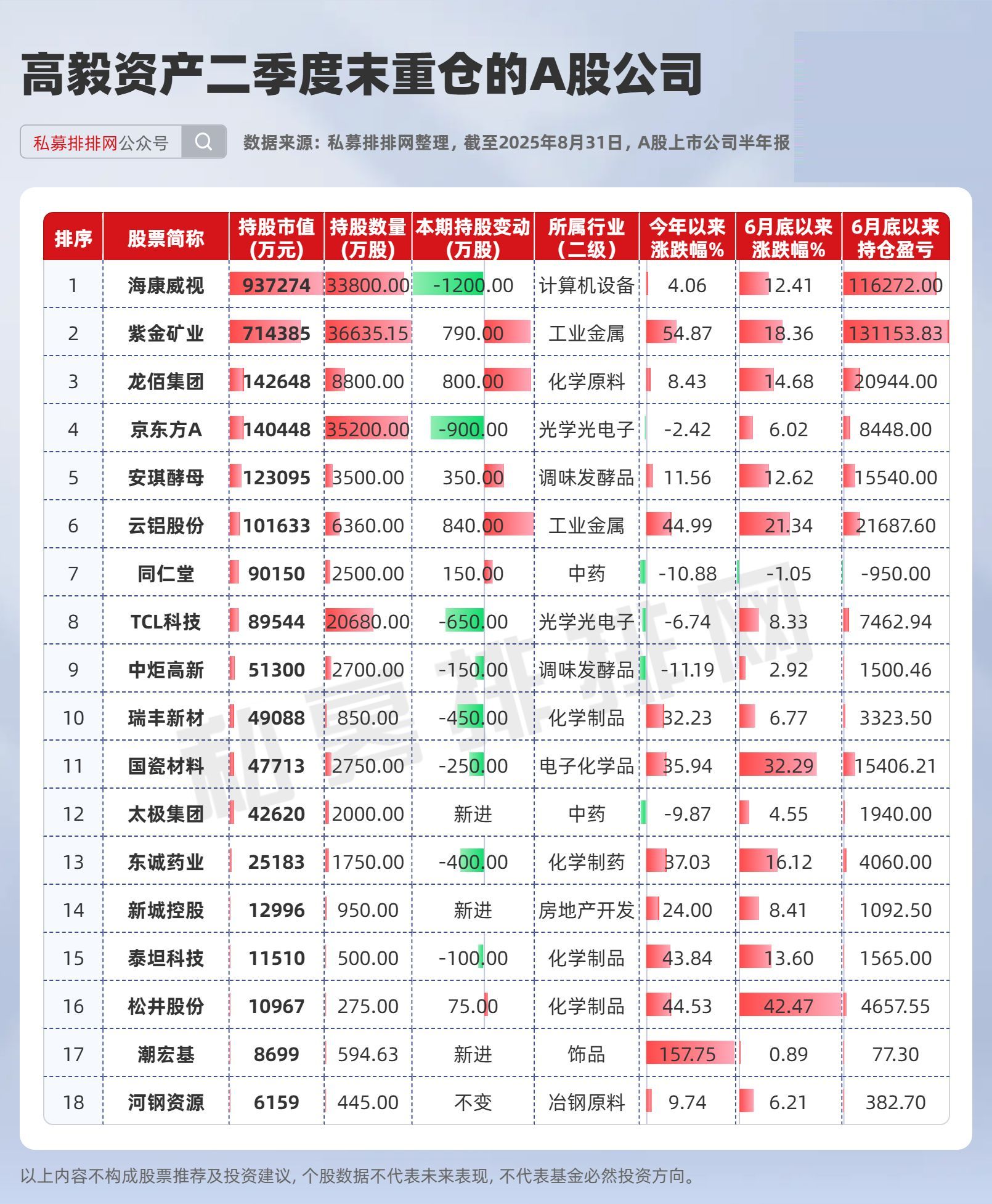 从私募持有公司数来看,高毅资产持有的公司数量最多,共有9家。持股市值第1的海康威视被高毅大幅减持1200万股,最新持股市值约为93.73亿元,二季度末以来股价涨约12%,浮盈约11.62亿元。“黄金股”紫金矿业持股市值第2,二季度被高毅增持790万股,最新持股市值约为71.44亿元,二季度末以来股价涨约18%,浮盈约13.11亿元。