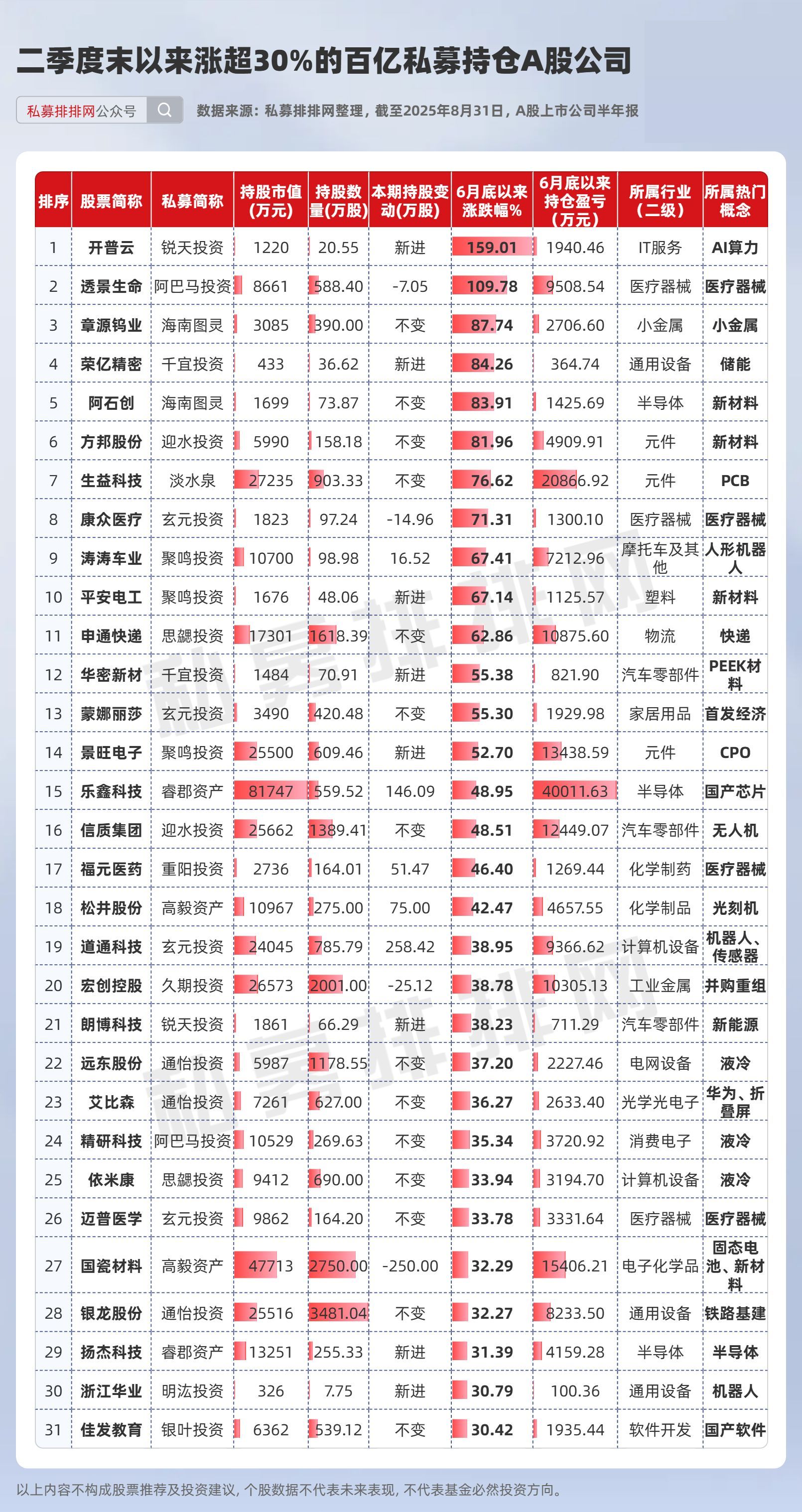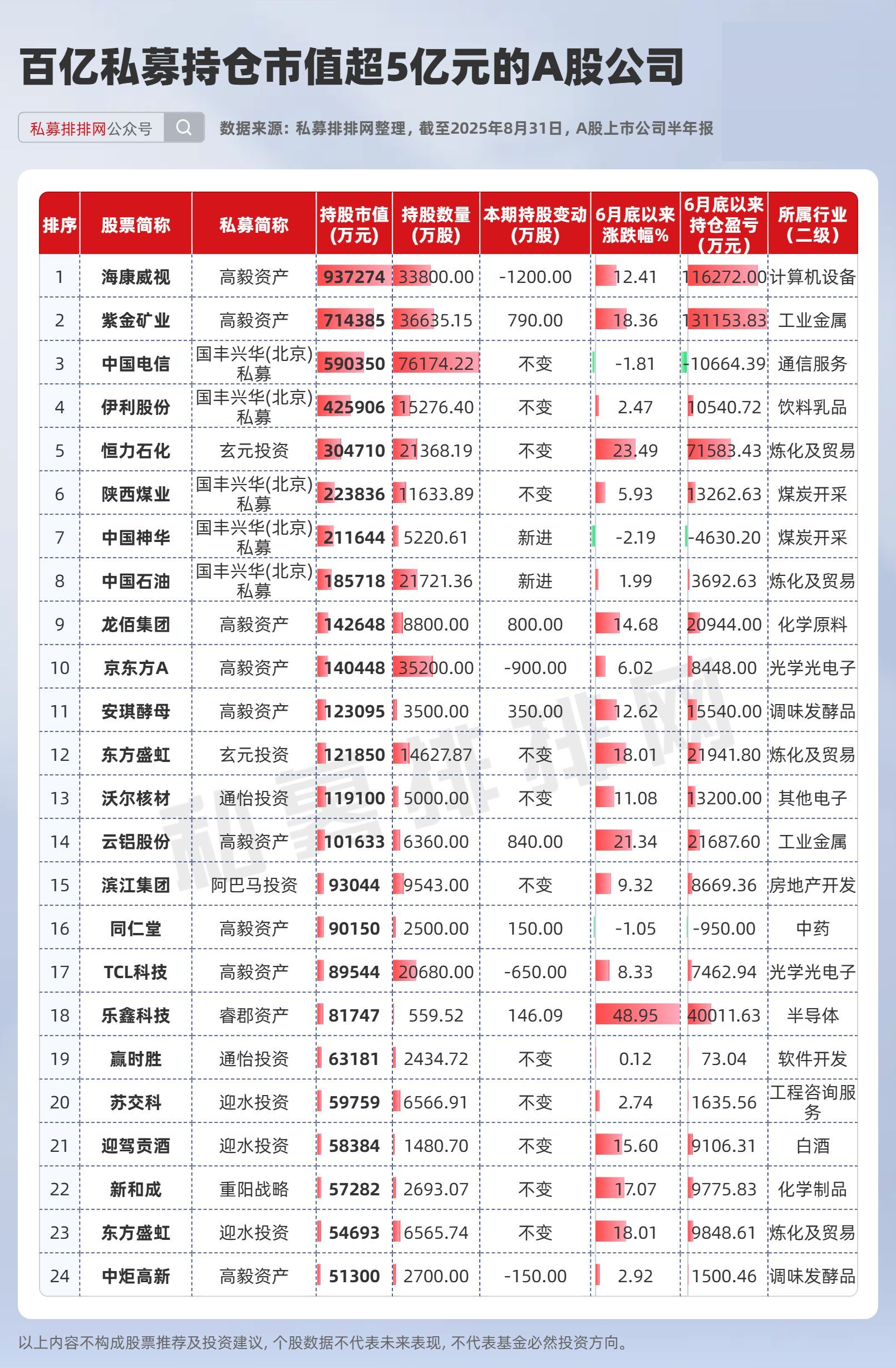 接下来,笔者将从A股公司(持有标的)和私募公司(持有人)两个角度为大家梳理百亿私募2025年二季度重仓股。
