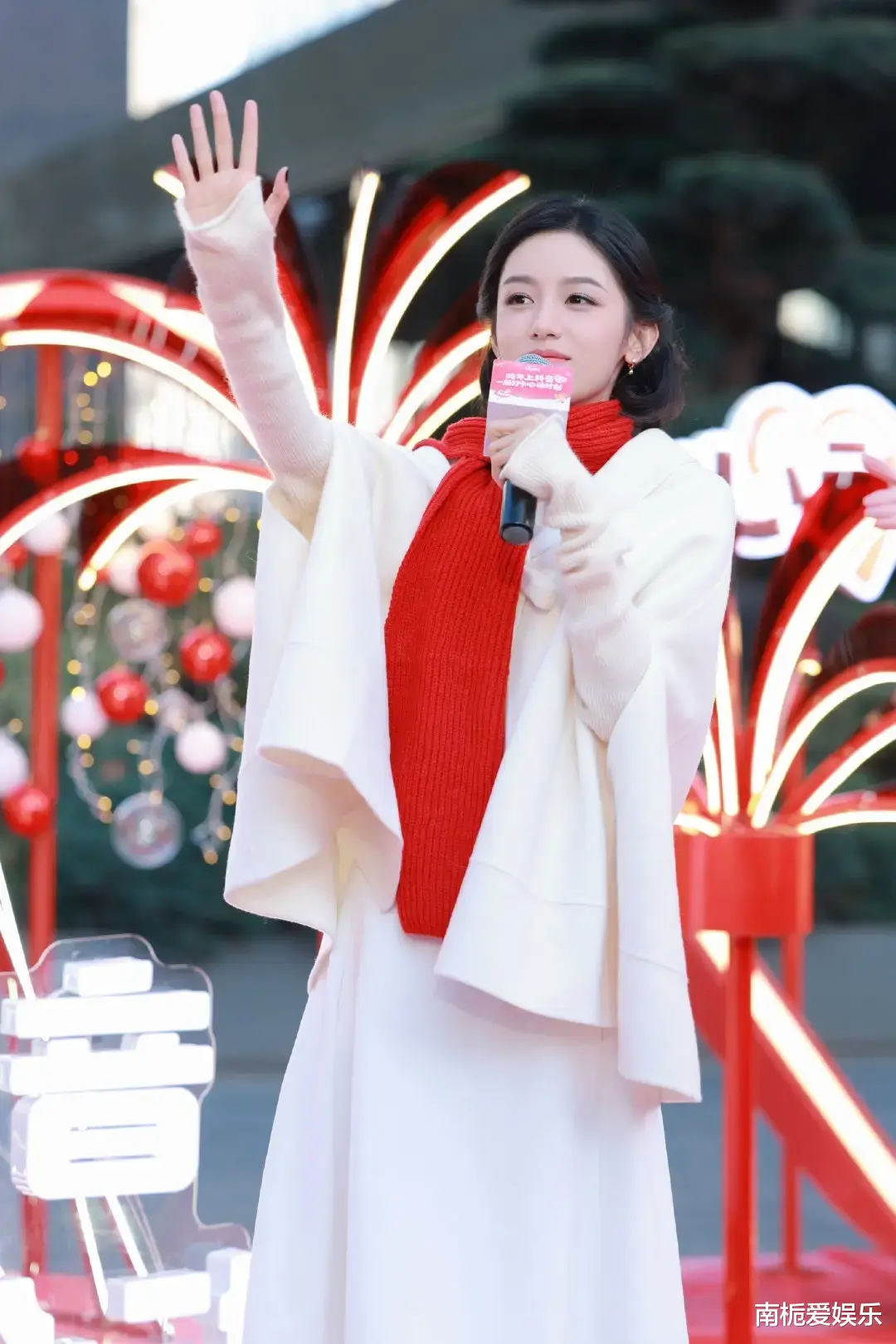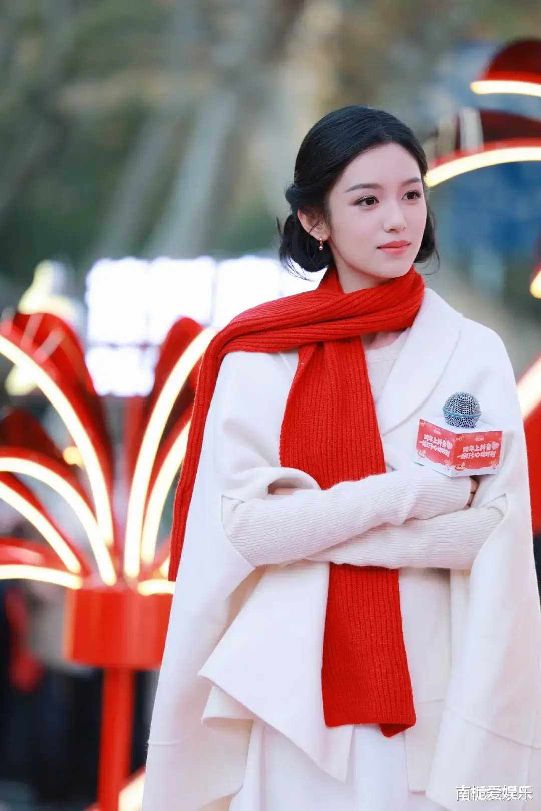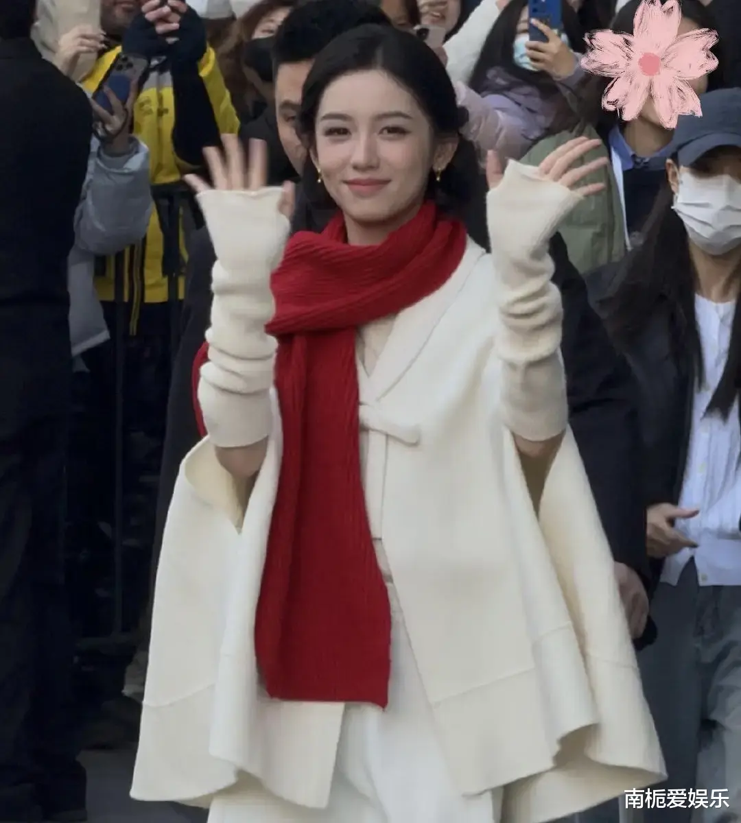 她的盘发造型干净利落,凸显精致的肩颈线条与清透气质,与整体风格相得益彰。粉丝与媒体纷纷用“温婉大小姐”“冬日女友”来形容她当日的气质——既有邻家女孩的亲切感,又不失优雅贵气。红围巾的明艳与白衣的纯净交织,营造出恬静与温馨并存的氛围。生图中她肤白胜雪,眼神灵动,笑容灿烂,被网友调侃“福娃本娃”,更有粉丝感叹“美得太权威”。
