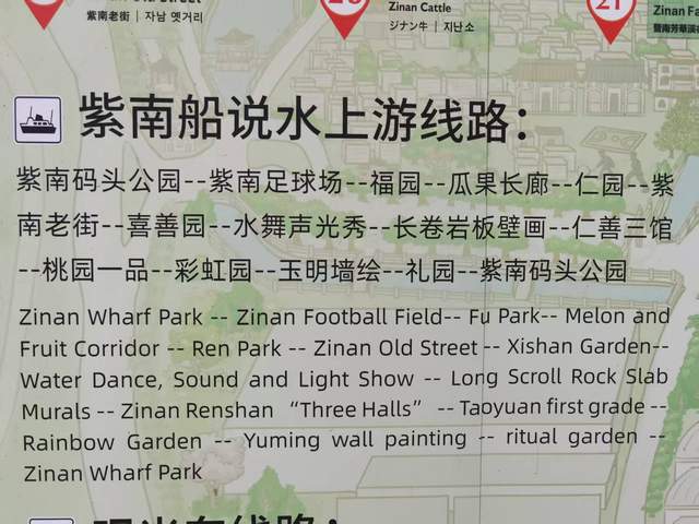 紫南码头公园起航 → 紫南足球场(岸上的活力)→ 福园(祈福纳祥)→ 瓜果长廊(四季的丰收)→ 仁园 → 紫南老街(仿佛穿越旧时光)→ 喜善园 → 水舞声光秀(夜游专属震撼)→ 长卷岩壁画 → 仁善三馆 → 桃园一品 → 彩虹园 → 玉明墙绘(色彩在水中的倒影)→ 礼园 → 回到紫南码头公园