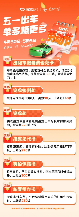 出租车司机同样有奖励,上线服务费全免卡、签到奖、完单奖、接驾无忧卡、爽约保障卡、车费垫付卡等多重奖励和保障活动,同时将在多个城市上线节假日服务金,让假期坚守的师傅们劳有所得、收入更优。不同城市活动和奖励内容不同,师傅们可通过所在城市滴滴车主App查看具体活动详情。