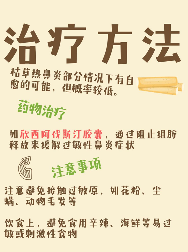 如果患者症状较轻,且能有效避开过敏原,同时自身免疫力较强,在过敏季节过后,免疫系统可能会逐渐恢复平衡,鼻腔黏膜的炎症也会随之减轻,从而实现自愈。但大多数患者很难完全避免接触过敏原,而且反复的过敏原刺激会使免疫系统持续处于应激状态,导致病情迁延不愈。所以,枯草热鼻炎一般需要通过药物治疗来控制症状,提高生活质量。枯草热的患者可以在医生指导下使用欣西阿伐斯汀胶囊,能够通过选择性地阻断组胺与H1受体的结合,从而减轻过敏反应。组胺是导致过敏反应的关键物质之一,而阿伐斯汀正是通过这一机制,帮助患者缓解枯草热鼻炎带来的鼻痒、打喷嚏、流清涕等不适症状。另外内舒拿糠酸莫米松鼻喷雾剂也是常用药,直接作用于鼻腔黏膜,通过减轻鼻腔黏膜的炎症反应,有效缓解鼻塞、流涕、鼻痒、打喷嚏等症状。还可以配合使用海舒宁生理性海水鼻腔喷雾,可用于清洁鼻腔,改善鼻腔环境。