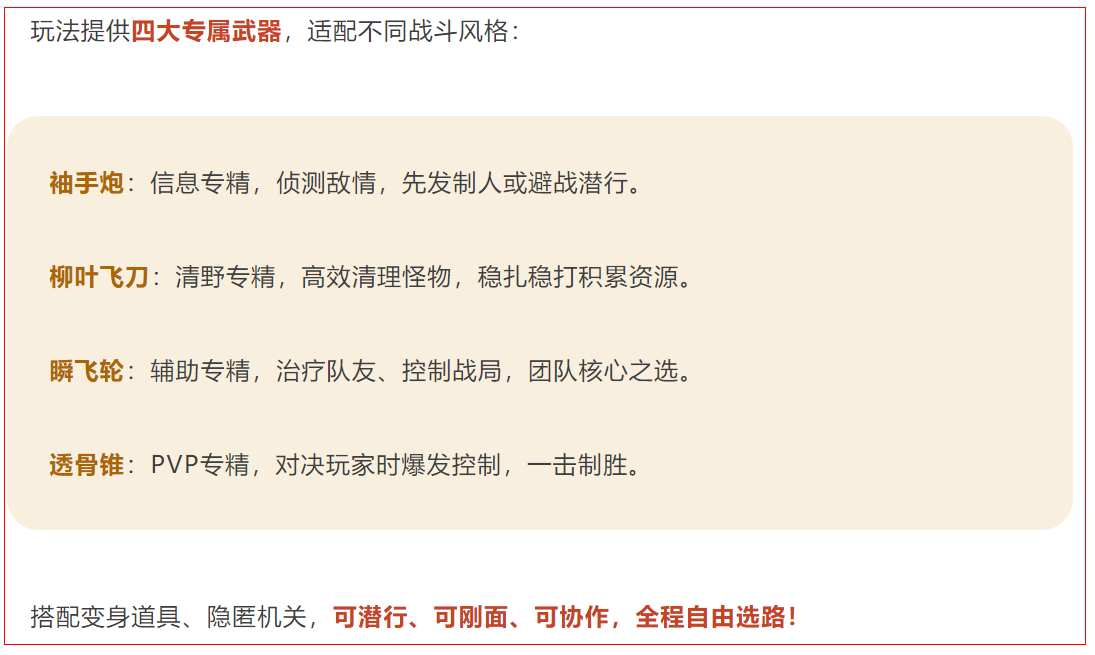 例如玩家进入玩法中可自由挑选的四大武器,有着爆发输出PVP专精的透骨锥,也有高效清野的PVE武器柳叶飞刀,还有让玩家能够专注潜行先发制人的袖手炮,搭配变身道具、隐匿机关等等,玩家在【瀚海夺珍】可潜行、可刚正面、可协作,全程自由“搜打撤”。