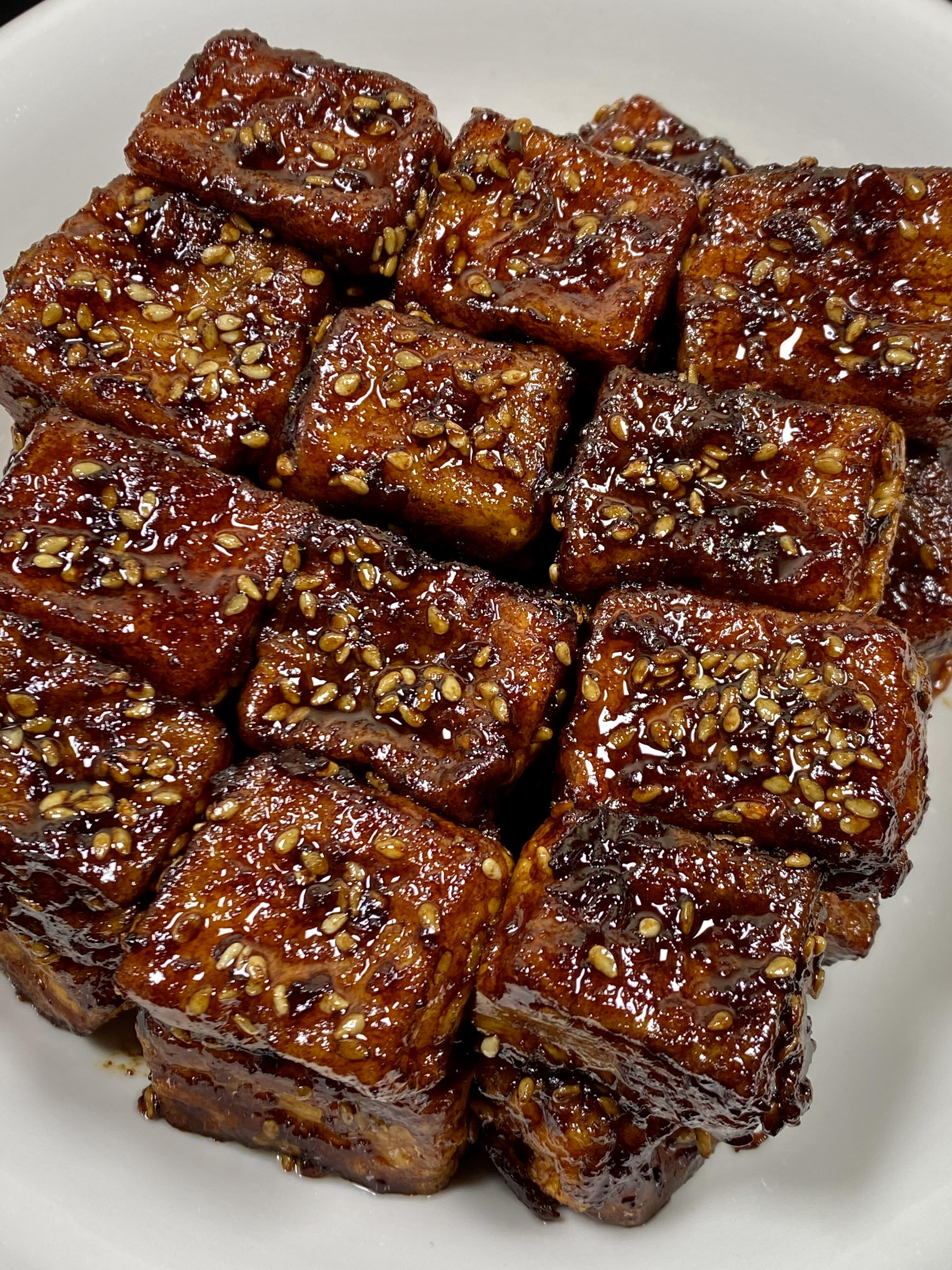 关火,盛盘。一盘色香味俱全的家常照烧豆腐就此诞生。煎得金黄的豆腐块被浓郁的酱汁紧紧包裹,在灯光下泛着诱人的光泽,白芝麻星星点点地散落其间,煞是好看。夹起一块,外层是微微酥脆的淀粉壳,内里却是豆腐特有的柔嫩与温热。咬下去的瞬间,先是酱汁的咸甜在舌尖绽放,紧接着是豆腐本身的豆香和芝麻的香气,口感层次丰富,越嚼越有滋味。这道菜确实是个“米饭杀手”,舀一勺浓郁酱汁拌在米饭里,就着外酥里嫩的豆腐,不知不觉一碗饭便见了底。