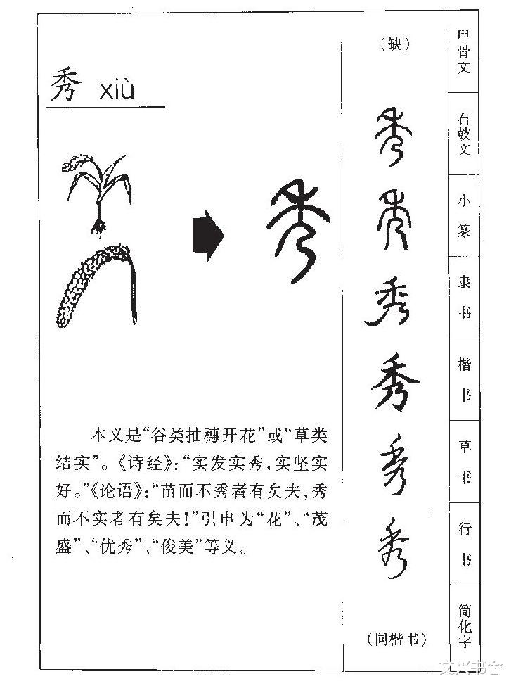 秀:禾穗之秀,实而不华“秀”字从禾、乃声,甲骨文字形宛如一株成熟的禾苗,稻穗饱满、微微下垂,尽显沉甸甸的质感。《说文解字》释曰:“禾实也,有实之象,下垂也。