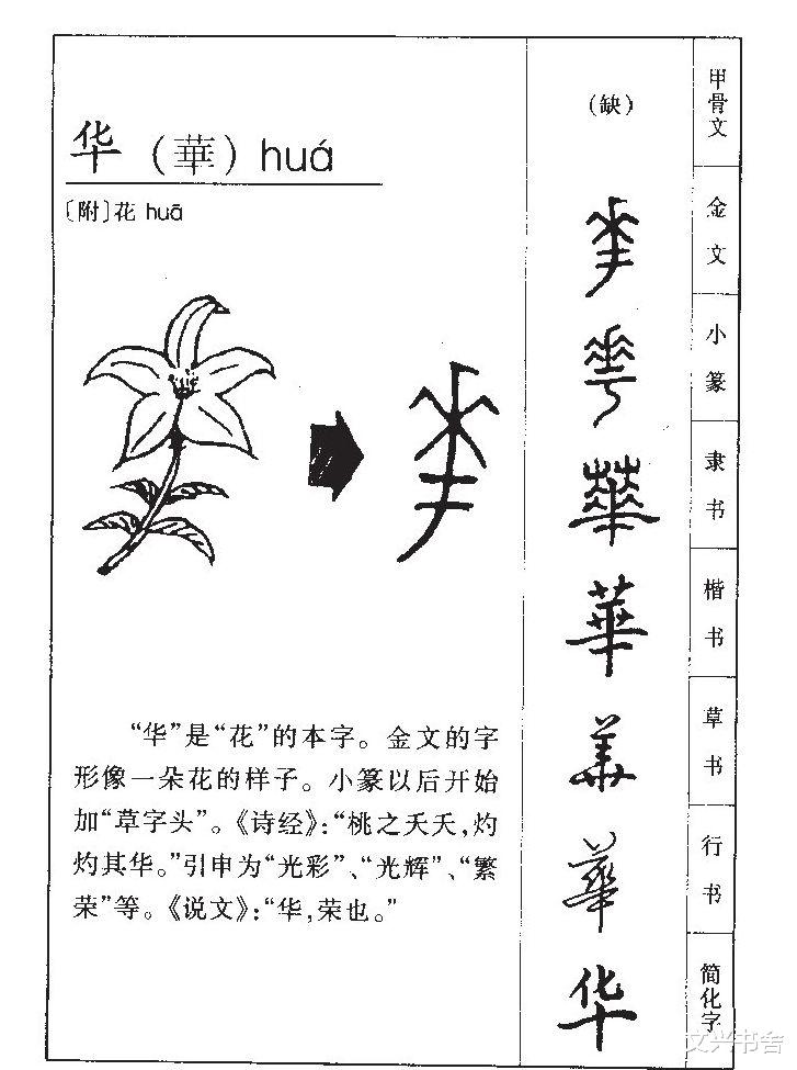 “华”是“花”的本字,其字源可追溯至甲骨文,字形宛如一株枝繁叶茂的树木,枝头缀满盛放的花朵,直观再现了木本植物开花的繁盛之态。许慎《说文解字》释曰:“华,荣也。”但上古时期,“华”与“荣”有着明确的分工——木谓之华,草谓之荣,“华”专指木本植物的花朵,自带一种挺拔、明艳的气质,是花朵最盛大、最张扬的绽放。
