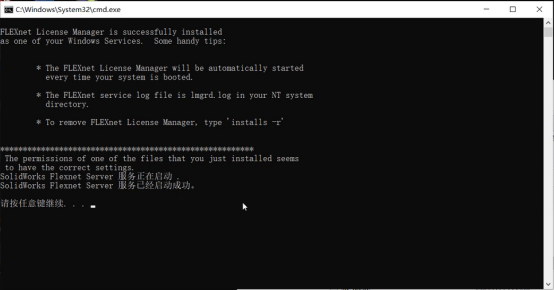 3、等待弹窗显示 “服务已经启动成功”,直接关闭窗口即可 —— 这时再打开 SolidWorks,大概率已经能正常使用啦!