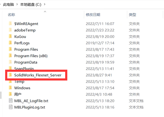 1、打开电脑 C 盘,找到文件夹【SolidWorks_Flexnet_Server】,双击进入(如果找不到,可直接在 C 盘顶部搜索框输入文件夹名)。