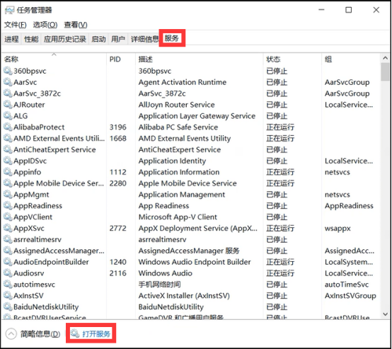 2、切换到【服务】选项卡,点击下方的【打开服务】。