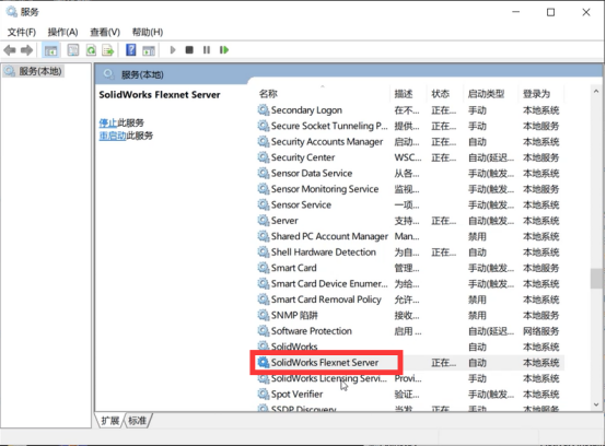 3、在服务列表中找到【SolidWorks Flexnet Server】,右键点击选择【属性】。