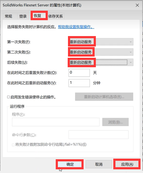 5、点击上方【恢复】选项卡,把 “第一次失败”“第二次失败”“后续失败” 右边的下拉框,全部选为 “重新启动服务”,点击右下角【应用】,再点击【确定】保存设置。