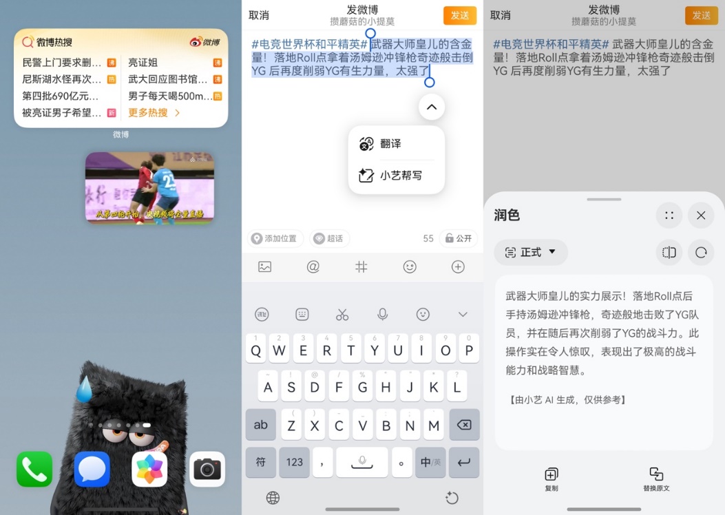 想第一时间了解到赛程信息?鸿蒙版微博的服务卡片直接把热搜“钉”在桌面,不用打开App,瞥一眼就能看到最新热门赛事动态,点击“更多热搜”直达搜索界面,想要了解赛事最新动态变得超级轻松。此外,当我想发篇评论比赛的微博时,鸿蒙版微博还支持小艺帮写润色文案,轻松告别词穷尴尬。