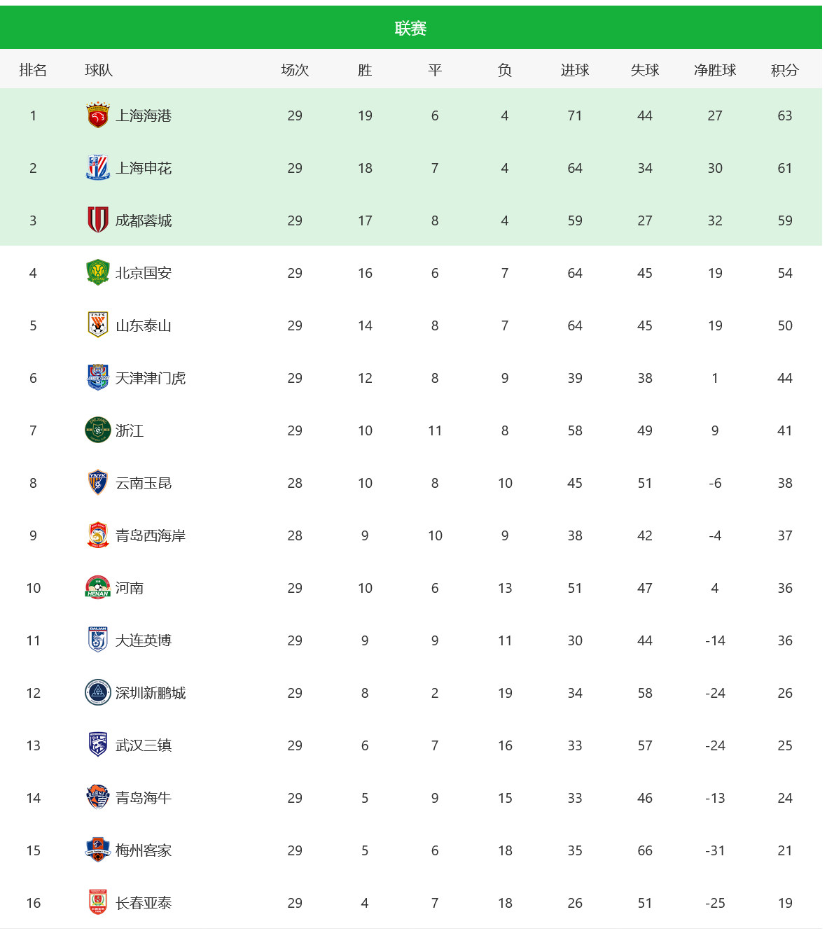 本赛季大部分比赛战罢,争冠范围再度缩小,又演变成上海双雄的“二人转”。上海海港目前领先上海申花2分,毫无疑问掌握争冠主动权,而成都蓉城本轮输球后直接退出冠军争夺。