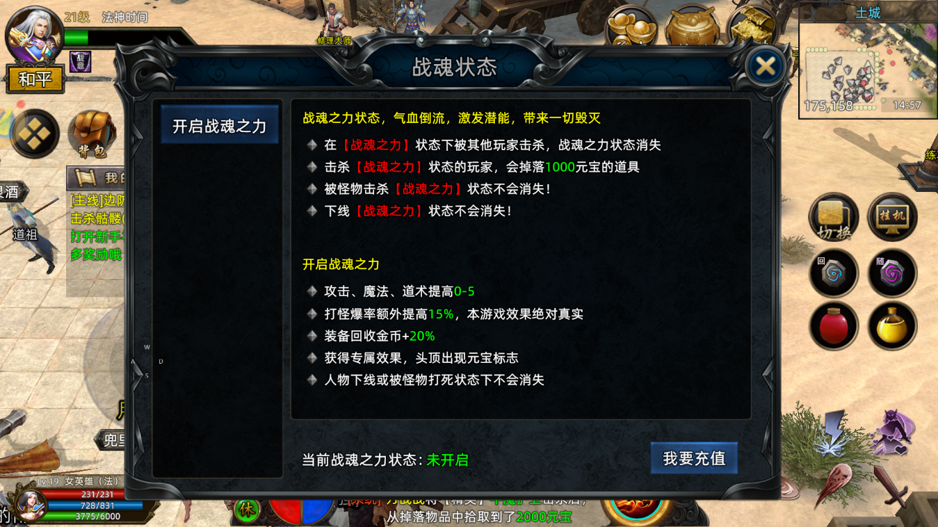 开启方式:玩家需要满足特定条件来开启战魂之力,从界面信息推测,可能需要进行一定的充值操作或完成特定任务(点击 “我要充值” 按钮或达成隐藏条件) 。