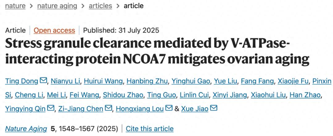 [1]Dong T, Li N, Wang H, Zhu H, Gao Y, Liu Y, Fang F, Fu X, Si P, Li C, Li M, Wang F, Zhao S, Guo T, Cui L, Jiang X, Liu X, Zhao H, Qin Y, Chen ZJ, Lou H, Jiao X. Stress granule clearance mediated by V-ATPase-interacting protein NCOA7 mitigates ovarian aging. Nat Aging. 2025 Aug;5(8):1548-1567. doi: 10.1038/s43587-025-00927-w. Epub 2025 Jul 31. PMID: 40745099; PMCID: PMC12350179.