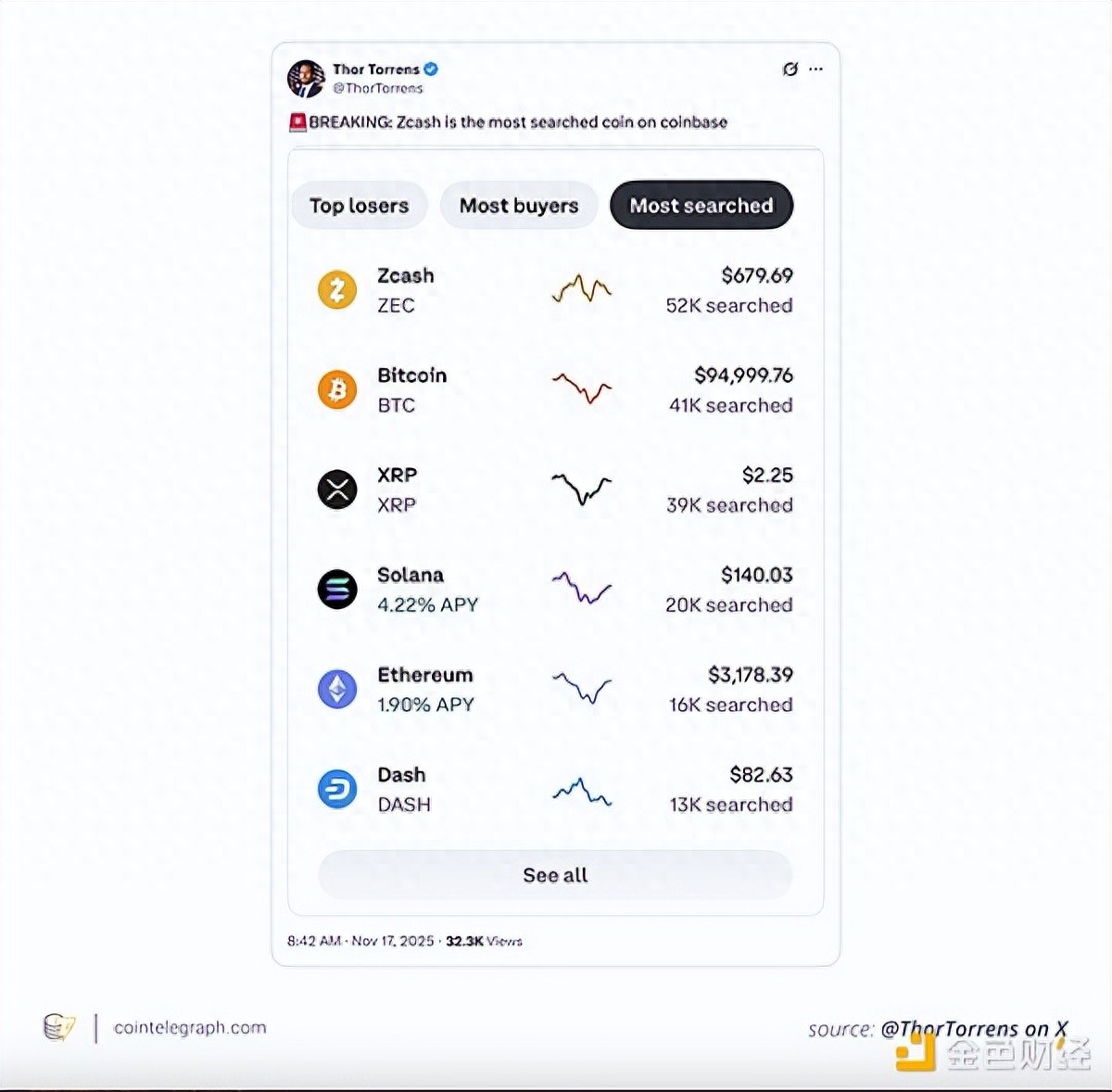 与此同时,Zcash在Coinbase的内部搜索排名中迅速攀升至榜首,用户搜索量超过了比特币和XRP,这表明散户的关注度也随之上升。