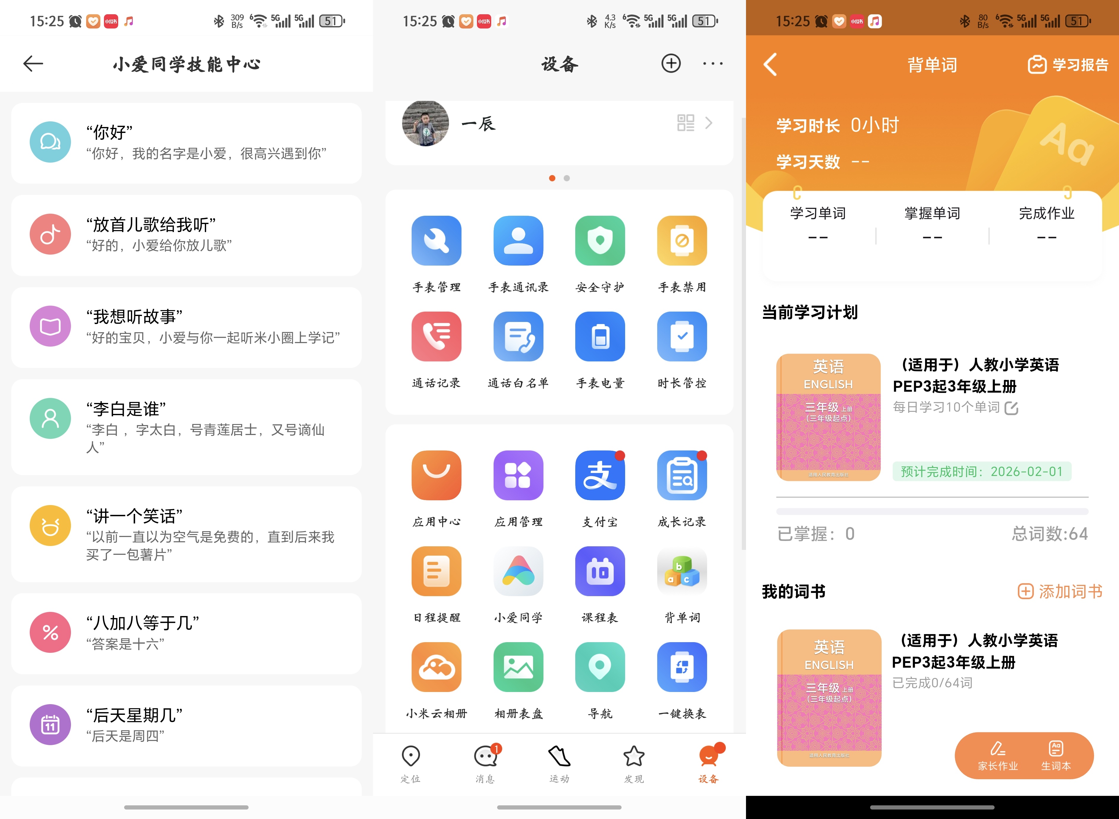 学习上也有小帮手,小爱同学有问必答,当然使用要有个度。还比如课程表提醒、单词背诵,利用碎片时间学点东西。